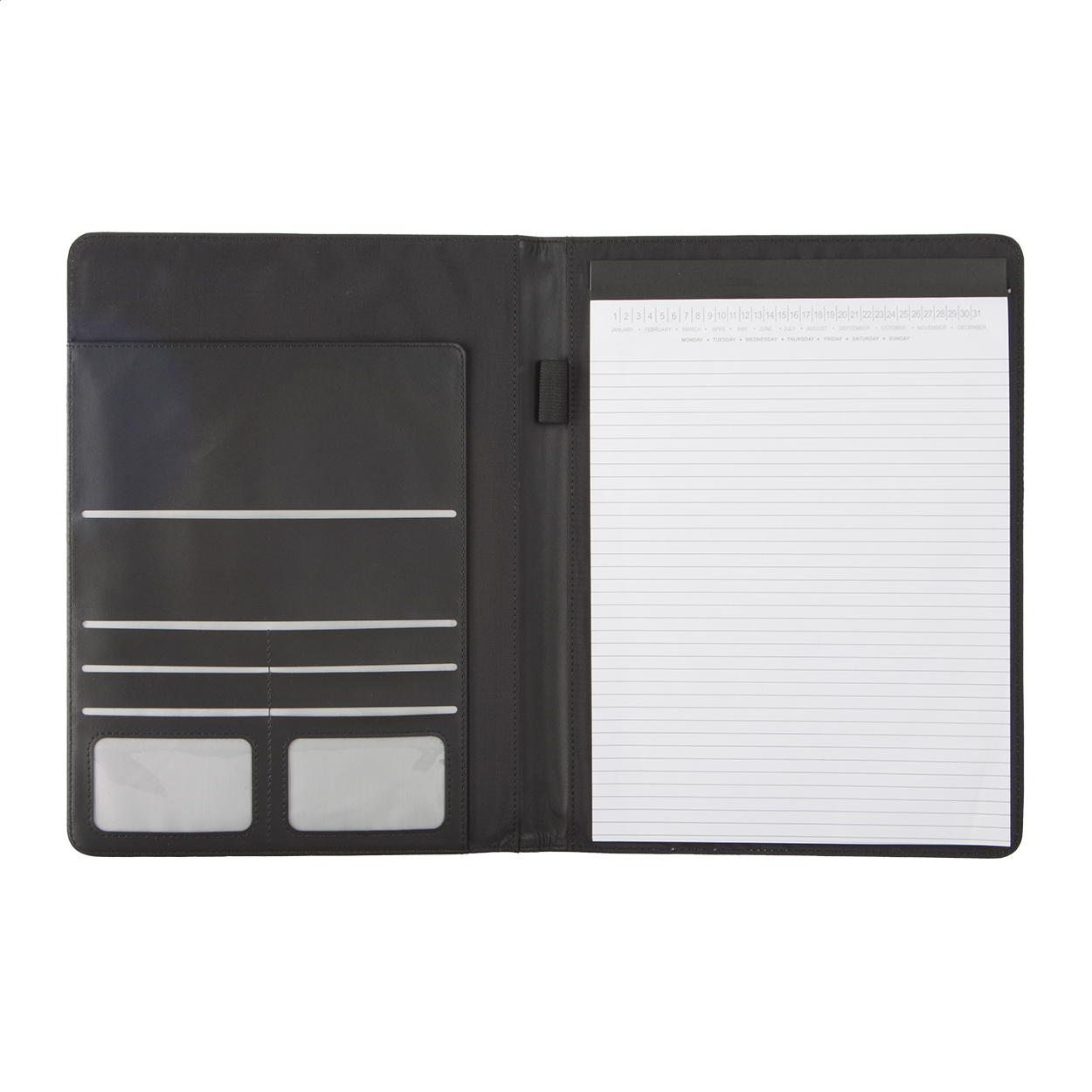 Dokument mapa veličine A4 od PU kože s bilježnicom od 20 obloženih listova, olovkom i držačima za posjetnice.