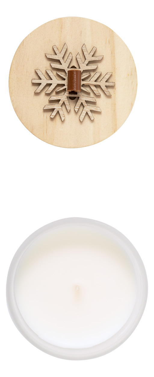 Mirisna svijeća od vanilije u staklenom držaču, s drvenim poklopcem s dekoracijom pahulje.