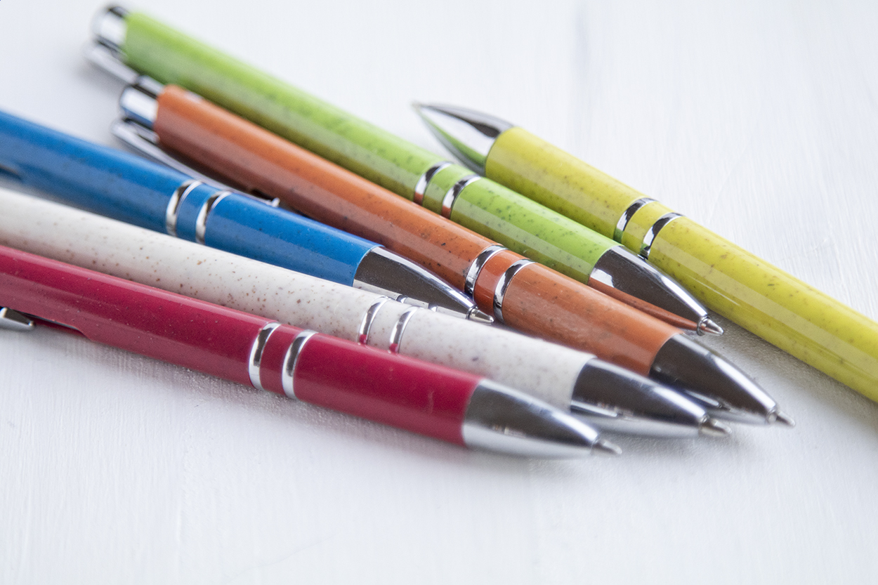 Ekološka plastična kemijska olovka od pšenične slame s metalnim dijelovima. S plavom tintom.