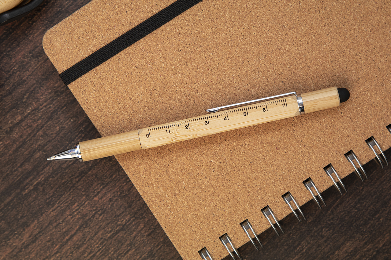 Višenamjenska okretna kuglica i dodirna olovka u bambusu. S dvostrano završenim bitom odvijača, libelom i ravnilom od 7 cm. S plavom tintom.