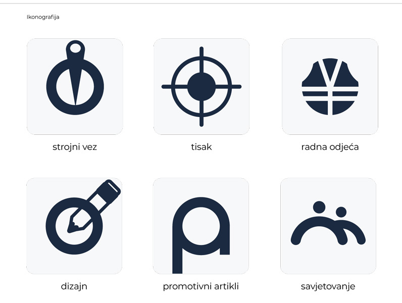 Sustav ikona - šest posebno dizajniranih ikona za naše ključne usluge: strojni vez, tisak, dizajn, promotivni artikli, radna odjeća i savjetovanje. Svaka ikona izgrađena je na preciznoj geometrijskoj mreži.