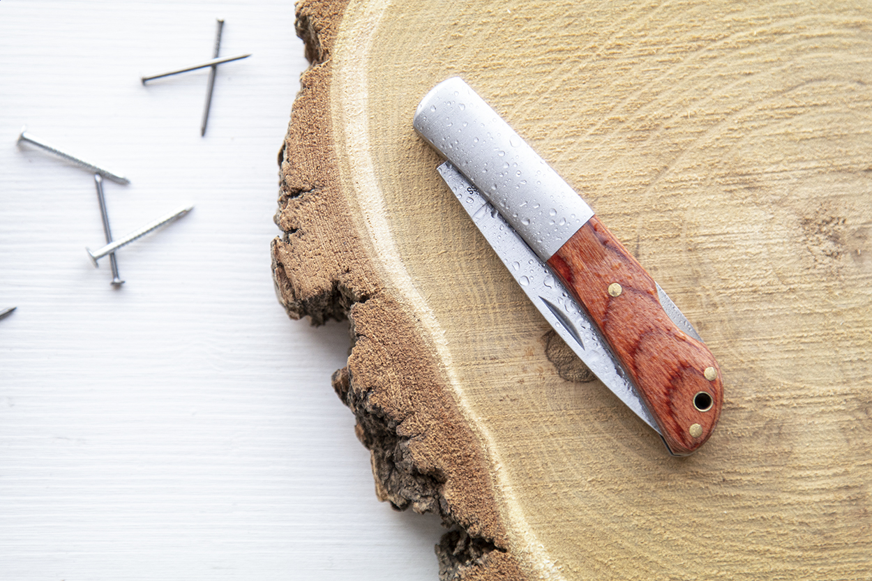 Nehrđajući čelični nož s drvenim premazom, uključuje sigurnosno zaključavanje.
