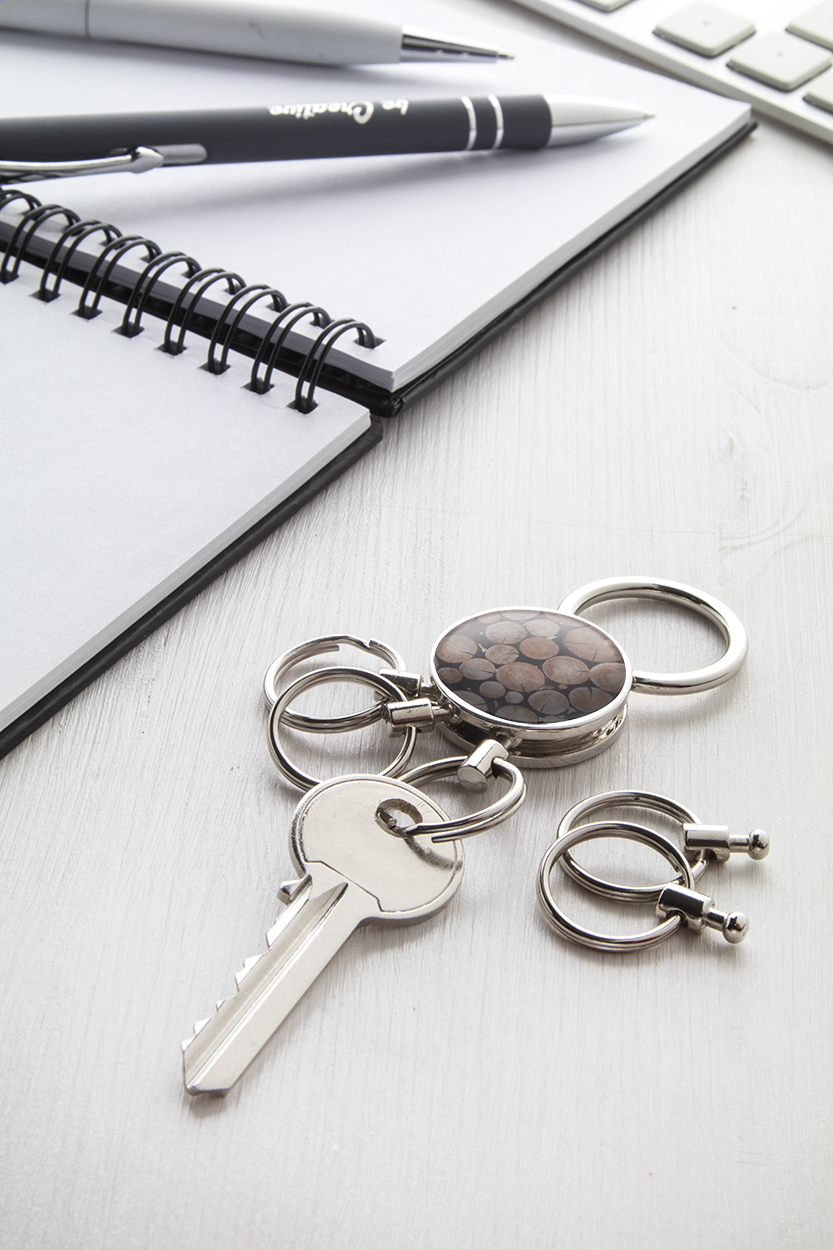 Metalni privjesak za ključeve okruglog oblika s 5 odvojivih prstenova. U crnoj poklon kutiji.
