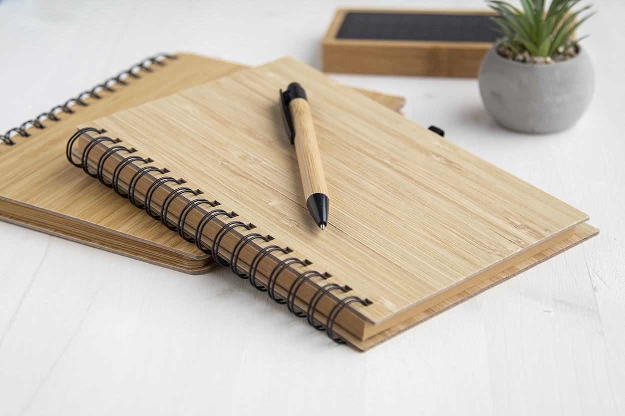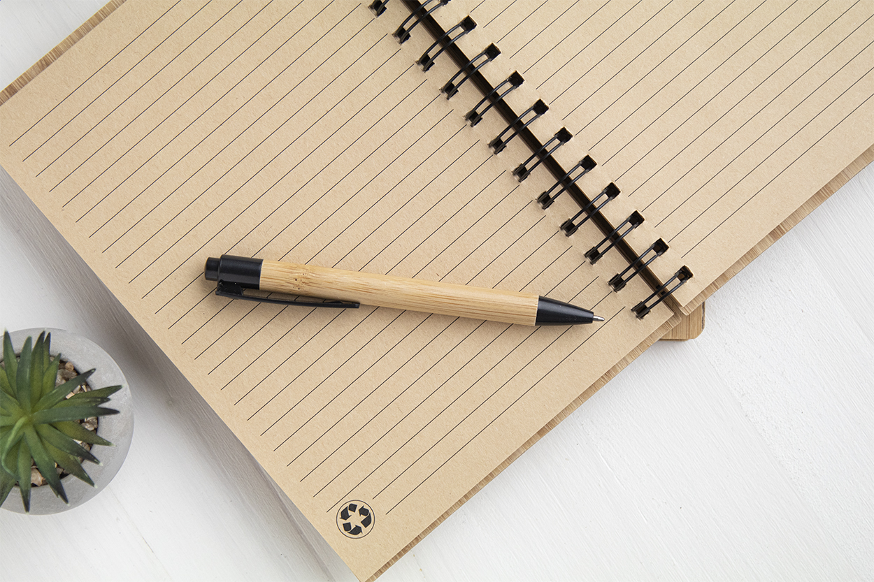 Spiralni rokovnik od bambusa. Uključuje bambusovu kemijsku olovku S crnom tintom. 80 linijskih listova, A5 veličina.