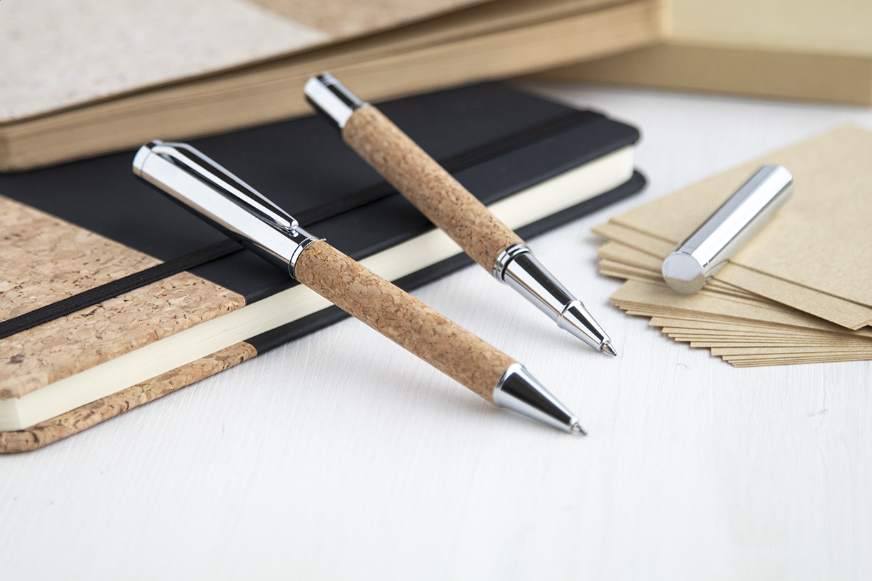 Elegantni metalni set olovke i rollera s cijevi prekrivenom prirodnim plutenom. U poklon kutiji od prirodnog plutenog materijala, s plavom tintom.
