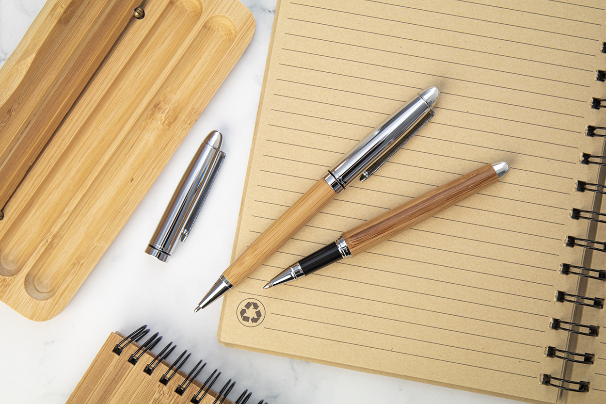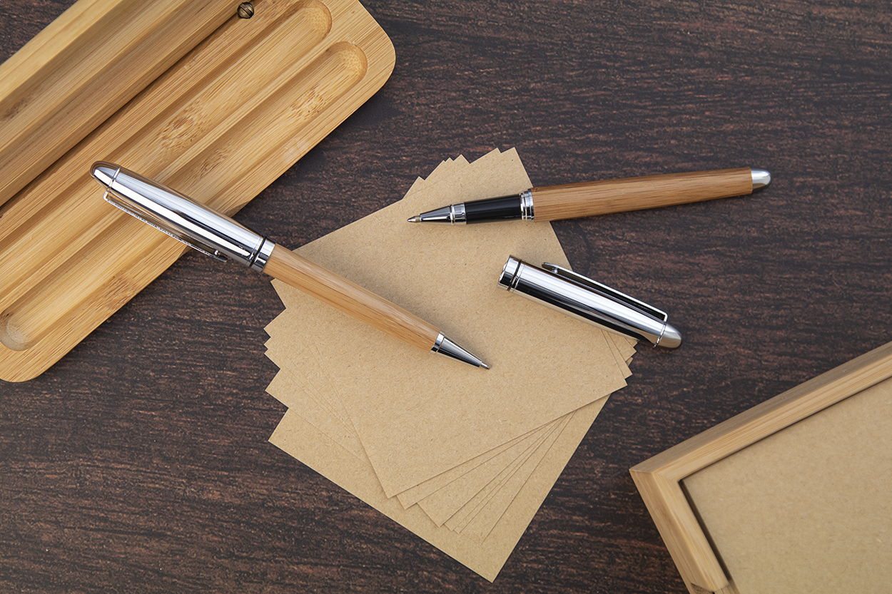 Elegantni set olovke i rollera od bambusa i metala u bambusovoj poklon kutiji. S plavom tintom.
