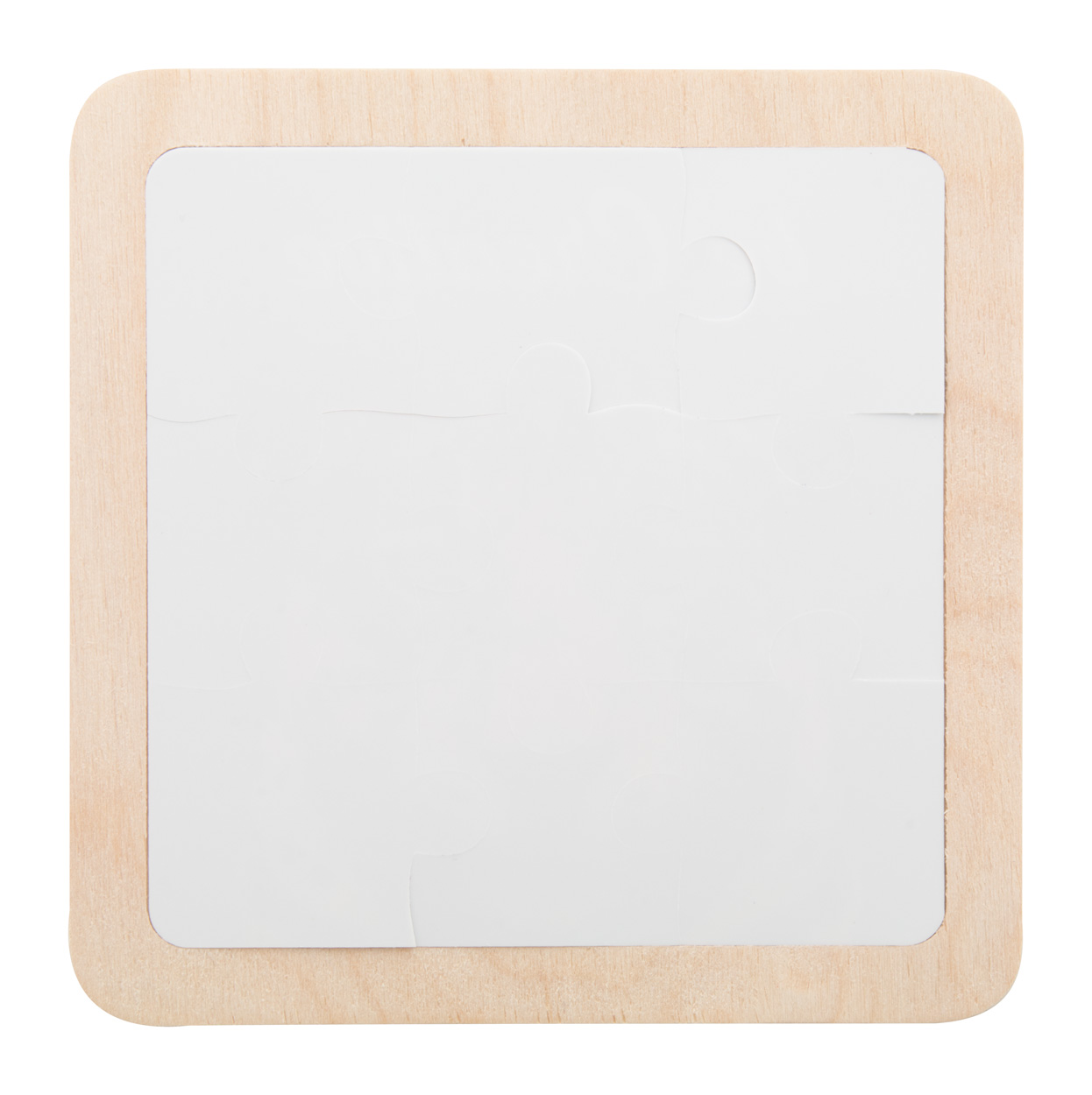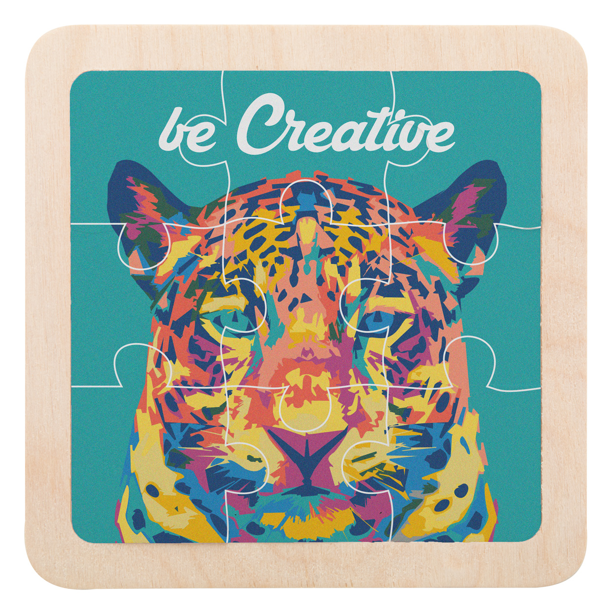 Plastična slagalica od 9 dijelova s prilagođenim grafikom u držaču od laminiranog brezinog drveta. Cijena uključuje UV LED ispis. MOQ: 100 komada.
