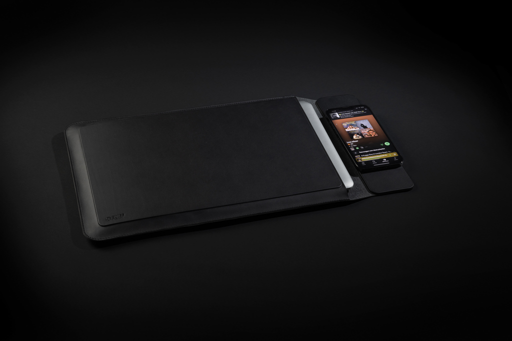 The Swiss Peak RCS Recycled Polyester 15W Magnetic Charging Laptop Sleeve, designed to fit 14-15.6" laptops, combines style, functionality, and sustainability. Use it to carry your laptop anywhere you go and when you arrive at your destination turn it into a work station. Made with RCS (Recycled Claim Standard) certified recycled polyester, the total recycled content is 6% based on the total item weight. This sleek sleeve features a magnetic closure and offers wireless 15W magnetic charging capabilities to keep your devices powered up on the go. It provides a perfect balance of protection and portability. The sleeve comes with a 120cm black RCS Type-C RTPE cable for convenient connectivity and requires a minimum input of 9V/2A. The product is packaged in a black Swiss Peak plastic-free FSC box. Item and accessories PVC free.