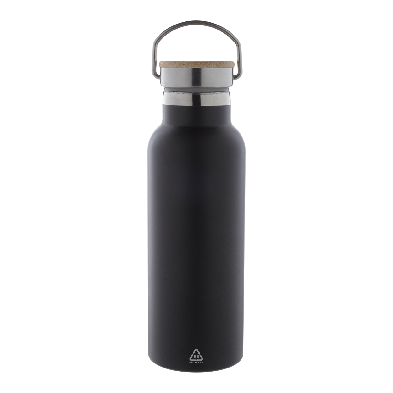 Boca s dvostrukom stijenkom od recikliranog nehrđajućeg čelika s vakuumskom izolacijom i bambusovim poklopcem za nošenje. 500 ml.