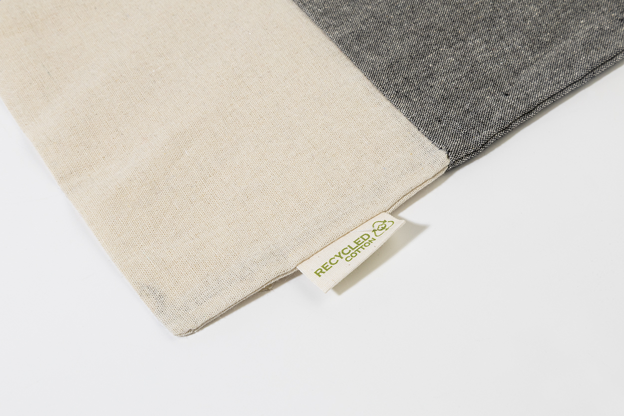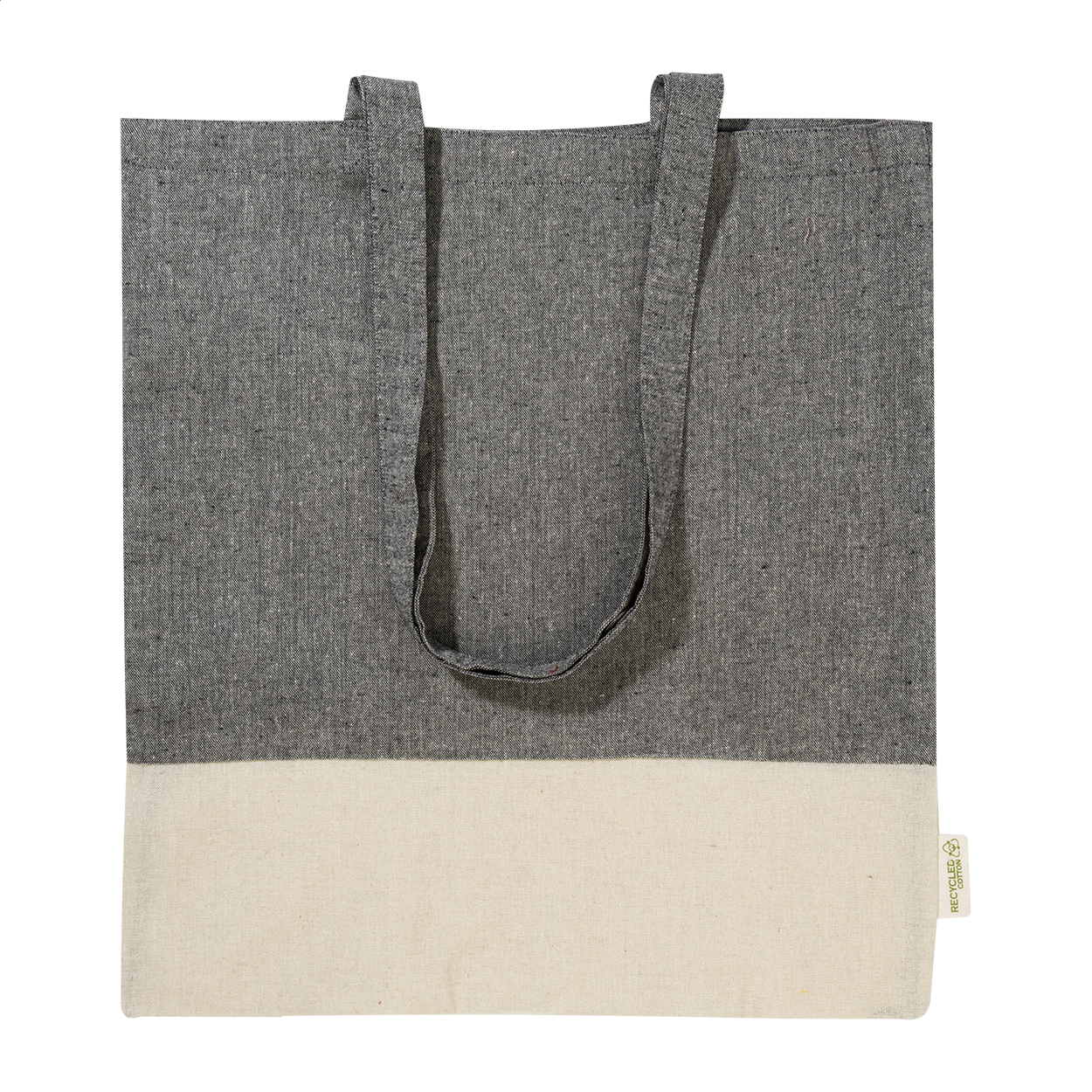 Reciklirana pamuk torba za kupovinu s dugim ručkama i prepoznatljivom oznakom recikliranog pamuka. 100% reciklirani pamuk, 120 g/m².